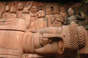 One of the thousand Buddhas carved into the rock near Guangyuan