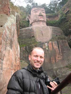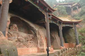 15th December 2005 - Leshan and its Big Buddha This day of rest involved a lot of walking up and down, trying to see the giant buddha (71 m high, the highest in the world - fact of the day!) from all angles. It was well worth the effort to see this 1400 years old giant carved off the sandstone cliffs. We also saw a collection of other buddhas, more recent, one of them is a 170m long sleeping buddha - cheekily carved out a whole mountain side. The downside to the pleasure of visiting empty sites during the off-season is fighting off the desperate people who pray on tourists. We got conned twice that day: once by a rickshaw driver who literally took us round the corner to a bus stop and later at night in a hot-pot restaurant. Hot-pot is a popular street food in Sichuan: there is a big pot of boiling water with chilli oil in the middle of the table and you cook in it whatever you fancy. We like it because we can see what we eat. Having said that, we were sold various kinds of intestine and other unidentified bits of meat, thinking they were big flat pastas. As we were far down the line of "we dare you" type of food, we even got (knowingly) some chicken feet. The flaps between the toes are vaguely tasty (of chicken) but god aren't they chewy! Frankly life is too short and if anybody offer you some in an aperitif/Christmas nibbles, don't bother. Oops, I have gone off the point. The bill came out at 133 yuan, which is way over the top. We simply refused to pay and waited until the bill came down to 80 yuan (still a rip off). China is sometimes tiring... |