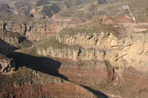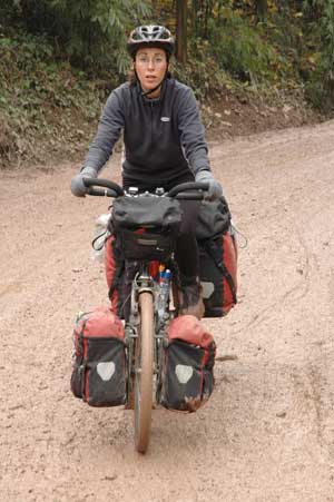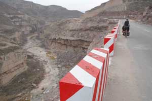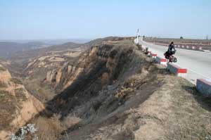 18th November 2005 - Km5 of road 233 to 20km Before Houko Falls - 88km We started the day by completing a long mountain climb up to a picturesque col. Whilst waiting for Isa, Terry was informed in no uncertain terms that we could not descend towards the Houko falls by that route - we must turn round and go back via another route. As any cyclotourist will know this is an impossible request when you have spent 3 hours cycling up a mountain pass and the detour involved an extra 5 hours of cycling. We weighed up our options and decided to go for it. As there were plenty police cars around, we concluded that on the other side of the mountain there may be a closed area to foreigners. Our only (poor) solution was to be as fast and as discreet as possible through the valley and the main town. As the road was downhill, speed was okay, but trying to be unconspicuous as a foreign cyclotourist in China is absolutely impossible. We gave it our best shot though and only stopped after an hour of mad cycling in a small side road leaving the main valley. We had made it! As we carried on a bit more slowly, we had time to notice that we were now in an entirely different area. The mountains were made of a sandy material (we found out later that it is a sandy deposit formed by the wind called loess - hey, we do learn things with all this cycling around!). The vegetation had totally changed and the habitation consists of caves dug straight into the side of the mountains (a nice changed from the modern white-tiled Chinese buildings). But on this smaller road, Chinese engineers have been a bit bold with the angle of the cut through the mountain and we had to pass a massive landslide. This was why the man on top of the hill told us not to go this way! But anything is impossible with a couple of touring bikes (well nearly anything). The rest of the day was simply amazing. We reached the top of the loess plateau, which breaks down into impressive cliffs with beautiful views on each side of the road. And as we came down the plateau, we were lucky enough to find a newly built road following a beautiful river valley. As the road is new, the landscape is practically untouched (no fields, no quarries, no manic digging in the river bed, no road number and no traffic) and for the first time in China it was really straightforward to find a quiet place to pitch our tent. |