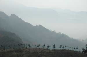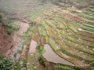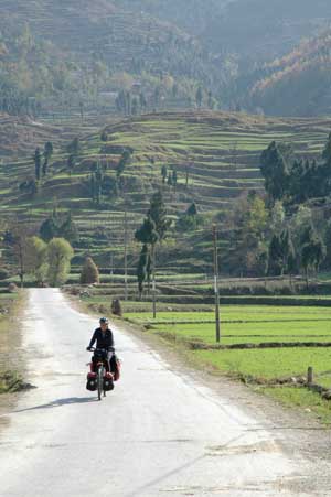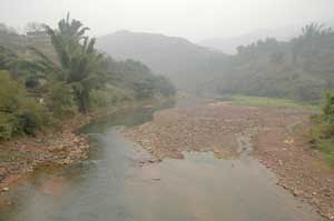 30th November 2005 - Foping to km1590 of road G108 - 92 km It was a day to get used to our new surroundings. Further down the valley, different types of trees appeared. The only ones we could easily spot were banana trees, cypress and palm trees. The rest of the forest was all new to us. We also spotted our first rice paddies, which made Isa stop complaining about the cold and the so called sub-tropical climate, because with all the ambient humidity the area is clearly a mosquito zone in summer. The river valleys were full of beautiful white boulders, but the new fashion seems to be to extract them (sometimes with huge cranes) to use them as garden ornaments. The river beds here again end up as messy construction/destruction sites with dozens of people digging, hammering and extracting.