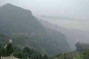 (above and below) Those classic Chinese mountains veiled in mist. Our dirt track is visible in the photo above - winding up the mountain side