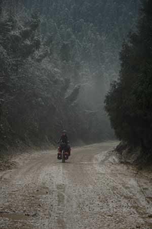 17th December 2005 - Muchuan to km1413 of G213 - 44km On starting the day, we noticed some signs indicating that there were road works on the G213. We took little notice of it and carried on happily, swerving between many groups of workers resurfacing, concreting, sweeping - all in no apparent logical order. This was fine until the road cover totally disappeared, leaving us to face a massive uphill and a road covered with thick mud. The day was therefore a very slow one and we only reached the top of the mountain at six o'clock, rather exhausted and totally muddy. The climb was beautiful. It started with bamboos forest at the bottom and on top there were tea shrubs and conifers covered in a thin layer of frosted snow. Beautiful, but a cold night camping was in store for us. It was however a day of record. Terry is keen on these, so let's mention them: 1327 m climbed in the day and our highest camping spot at 1682 m. |