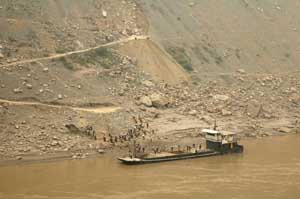 The river Yangtze - labour is cheap in China - here a collection of labourers are filling up the ship with stones by using wicker baskets on their backs