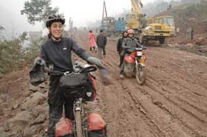 19th December 2005 - Zongcheng to Town with the New Dam - 66km Following a discussion with the knowledgeable local policeman, we decided not to continue on the G213, which had another off-road mountain waiting for us to tackle and to take a detour following a flatter tarmac road. The decision also took into account the degrading state of Isa's foot (one toe was starting to turn purple) and morale. The road over the mountain was high, cold, misty and bumpy - not really suitable for rehabilitation of poorly feet! The road along the river Yangtze was very pleasant despite the few bus and lorry drivers being particularly vicious with their horn. We crossed many small villages set in clusters of green strange trees. All the kids we passed ran along with us, some even gave Terry a push up the hill. And as we are in a tobacco growing area, the farmers all smoke some homemade cigars in a strange classy kind of way. As we reached our destination (we still don't know the name of the city), we passed the Yangtze River Western Canyon. But what a state it was in! The road had reverted to mud, we were crossing a bulldozed village and then an immense building site guarded by the army! We were in the middle of the newly constructed dam, which comes along with a newly constructed high road, hundreds of workers and smoking trucks, decibels of noise welding, rock blasting and inquisitive workmen. All the nice valley route we followed, all the villages we saw today are doomed, to be submerged under 50 metres of water! |