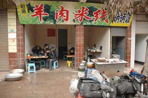 Typical Chinese road side cafe, all open to the elements, cooking on the pavement and the obligatory crowd huddled around asking questions and pointing at the map