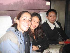 20th December 2005 - Town with the new Dam to Yibin - 37km The dusty dam town had been transformed into muddy town overnight. It was drizzling and everything was cold and wet and muddy. We prepared mentally ready to follow the rest of our detour route, but the policeman's information turned out to be duff information. A new motorway was being built alongside our road, and the tarmac was covered in a very thick and sticky layer of mud. After a few kilometers uphill, both our bikes were stuck in the mud - we could not even push them any further. We went back to our starting point and discussed our next move over a steaming bowl of noodles. Well, we were not going to go back where we came and there was only one option: the next big city of Yibin from where we were hoping to get a train or a bus South, without being too sure where to. The road to Yibin was rather unpleasant, busy, muddy and once again a new road was being constructed. The first thing we came across in Yibin was the bus station. We were quite tired by then because the road had been rather unpleasant. So we stopped there, catching up with our breath and our thought and looking hopelessly at the Chinese names on the display boards. It must have been less than a minute before a man came along and asked us where we were going. Isa tried to explain that we did not know where to go (no point even trying to explain about our feet and mud problems). She mentioned ChongQing because it is the only name Terry managed to decipher on the Chinese board. The man must have understood that we did not know how to get to ChongQing because the bus driver personally came out to fetch us: we had ten minutes to embark with our bikes before the bus went! And so before we new it we were en route for ChongQing -m wherever and whatever that was!. The bus was pretty full: our bikes were in the alleyway between the seats, together with three 150mm concrete core drilling machines brought in by a group of workermen. We were sitting close to XieYi and ZhouXiSheng, a lovely couple who insisted so much that we come with them to Jianjing for a party, that we could not refuse. They may not have realised that along with us and the bikes came a lot of bags... At seven o'clock the bus left us on the hard shoulder of the dual carriage-way to Jiangjin and it took ZhouXiSheng one hour and a half to find a van driver who finally accepted driving us, bikes and bags the 30 km South to Jiangjin. We went partying still wearing our cycling shorts. It was okay for the delicious hot-pot we shared with our friends and friends of friends, but a bit too hot for the karaoke-disco that followed. The set up was typically Chinese, i.e., all was done in a small booths where we had beers served by father Christmas (the Chinese one!), a karaoke TV and disco lights. We started by singing Chinese songs with bits of English so we could all join in. Then the whole little room was turned into a proper flashing electronic music disco. Within the 10 square meter of the small room, there was no escaping and even grumpy old Tel had to shake his body to the electronic vibes!