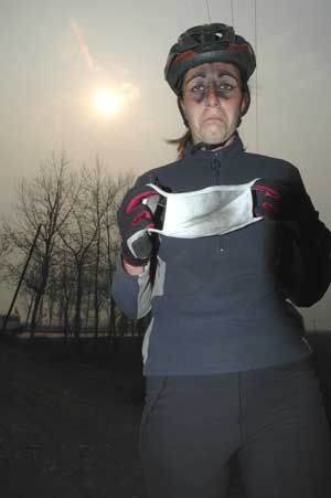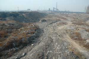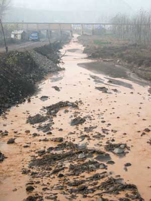 16th November 2005 - Lingshi to Linfen 115km And we thought the day before was the worse we had so far... Today was pure cycling hell. Trains of beeping coal lorries, cold and smoggy weather, bad road surface. And also, the accidents: we saw one cyclist and one biker badly knocked off, pools of blood on the road and an overloaded coal lorry tipped on its side. Everything guaranteed to make cyclists feel ill at ease. But we haven't mentioned the rivers. When they are flowing, they have marvellous tinges of deep black, satsuma orange, yellow, plum or even apple green with foam on top! The arid climate and irresponsible small scale industry ensure that the rivers are completely dry or comprise of a toxic cocktail of industrial waste, domestic effluent and the results of being the local refuse disposal point. The valley is so busy that we even struggled to find a picnic spot. The sun, or lack of, is also an interesting feature of "coal hell" valley. By 16.00 it was bright orange, by 16.30 bright pink, just before totally disappearing behind the layer of pollution.
