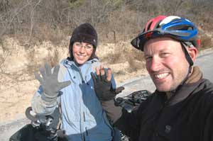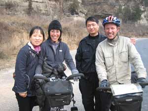20th November 2005 - G309 to 43km North of Huangling - 75km The day was cold and grey, but we carried on our way following some very pleasant river valleys. After a quick stop in a market, where we actually managed to block the main road because of the crowd gathered around us, we found a quieter spot for a picnic by the river. As soon as we started eating a car stopped and three men walked towards us. No need to say that we were a bit grumpy by the arrival of these nosey people. But as it turned out, they were policemen and demanded that we do not go to the next big city, which is an army base and therefore closed to foreigners (see our section on closed areas). They asked us to go back on our tracks and head for the main road G210 (a 200km detour!). We were happy they stopped to tell us this as they surely saved us from a lot of paperwork and maybe a hefty fine. After closer inspection of our map, we decided to carry on forwards and take a smaller road north of the Army town. We were a bit nervous carrying on on the same road for the next 20 km. A car stopped and Isa panicked, but its occupants only wanted to have their photo taken with us, pfff! (as long as the photo does not end up in the police files!) |