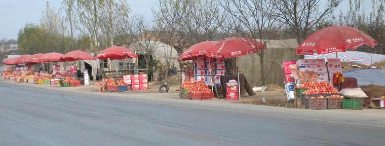 21st November 2005 - North of Huangling to Huanglong - 92km We were very lucky to find that the small road we took had been newly surfaced. It was extremely quiet and pleasant and crossed a huge forested area. We had to climb another mountain, but the views on top were magnificent. We followed the summit ridge of the mountains for more than 30 km. Very relaxing - and absolutely no traffic. But as with all nice things, it was not to last. We soon joined the main G210 that we were to follow for 200km to Xi'an. We crossed an apple producing area called Laochan. A bill board proudly claimed that "it is the best region for growing the best apples in the world". Still, not a drop of cider in view for Terry. To compensate the lack of the precious fluid, we purchased one meter of apples (literally) at one of the hundreds of small apple selling stalls that were bordering the main road. We then carried on to the town of Huangling where we treated ourselves to a hotel room and a shower. There was something worth seeing in Huangling, but unfortunately nobody could explain to us in English what the Mausoleum of the Yellow Emperor was. We cleared the mystery out in Xi'an: this is the oldest Emperor tomb in China. It is 5000 years old (the tomb with the terracotta warriors is just a mere 2200 years old). |