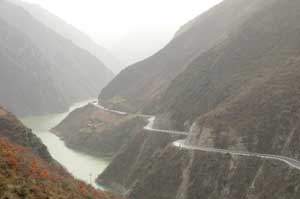 18th December 2005 - km1413 0f G213 to Zongcheng - 49km This could have been our best camping spot ever, but we woke up to falling snow so we had no views on the beautiful peaks around. However, we had 1500m descent ahead of us. Yippee! It will seem like a dream to all of you mad mountain bikers but with a full set of loaded panniers, it is a very weary business on muddy roads. We were happy to reach a newly concreted section of the road at the bottom of the valley. Yet this was of short duration as we still had another 15 km of off-road to the town of ZhongCheng. However the scenery had totally changed (this is the brilliant thing about crossing over mountains): we were now following the river Yangtze. The temperature had risen from 2 to 12 dC with our big descent, the vegetation looks always more tropical and it had not been raining here so the roads were dry and dusty.