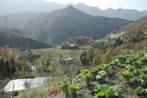 28th November 2005 - Zhouzhi to km 1445 of G108 - 85 km We soon turned left into the mountains. The valley we climbed was once again awesome, and different from anything we had seen so far. Here, the mountain sides were precipitous, the trees were still green and there are streams trickling down from all sides. On the far top of the mountains, about 200m or so above us, we could see many farms and terrace fields. How on earth do they live up there? The valley was beautiful, but offered no camping spots. In the evening the temperature started to drop down seriously and we gave up. We stopped in a restaurant and ask about lodging. The owner had a bedroom for us and cooked a good warming meal, which we ate around a stove in his bedroom, the only source of warmth to be found. Motorways are being built all over China