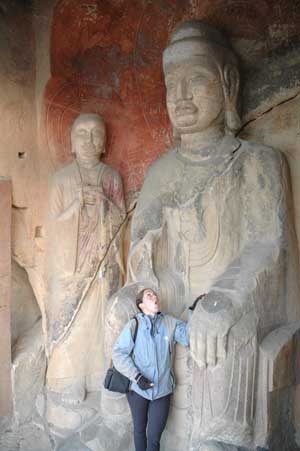 Towards the end of the day, we met a cycling club going back to GuangYuan, the town where we planned to stop. But as we were going along with them, two of the girls skidded on a patch of gravel and ended up with badly wounded hands. Nurse Isa got the first aid kit out (once she could remember where it was stored - we have not needed it for months) and cleaned up the wounds. After many thanks and a big photo session, we left our cyclist friends to visit an amazing temple which we passed. Thousands of carved buddhas, some more than 1400 years old, were looking at us from the side of a cliff. We decided to have a closer look on the Quian Foya grottoes before stopping at GuangYuan. |