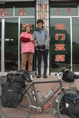 13th December 2005 - Chengdu to Meishan - 95km The cloudy weather had not lifted at all and overall, it was another cold, grey cycling day along a busy road, apart from a lovely section cutting through villages and fields and along the Jialing river. It was a nice road, but as usual packed full of activity: people are everywhere - sitting outside drinking tea and playing dominos, making baskets, working in fields or cutting bamboo. It took us more than an hour to find a suitable wee spot (for Isa)! We reached the city of Meishan with no high expectation. It is another newly developed city, with huge four lane roads cutting through the surrounding fields and awaiting for further building and all built around the standard new city grid system. After mistaking a restaurant for a hotel (easily done), we had to ask for help. A security guard snatched us away from the gathered crowd and led us to a hotel with his motorbike. We were at first very wary as he stopped in a dark street to ask us about how much we wanted to pay and we seemed to have gone a fair way in the direction we have just come from. But he did find us a really good and cheap room. He was also insisting on taking us to a restaurant and we decided to follow him. He sat down with us and insisted on paying for everything. The conversation was rather limited, but we gave it our best shot with our dictionary, mime, drawing and hand gestures (Isa's forte). But suddenly his phone rang and he had to go back to business on an emergency. As we had just finished the meal, we really thought that he would not come back - leaving us to pick up the bill (the oldest trick in the book). But he did come back and absolutely refused that we pay for anything. He said that he was happy to have met his two foreign friends. It was a great lesson of generosity to us. What made us feel so bad about it, is that we have been thinking all the way that the security guard wanted something from us when he was simply generous. It is sadly something we are not used to in Europe. |