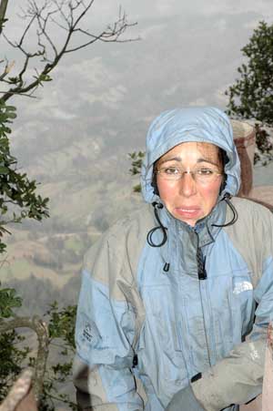 5th December 2005 - JianMen to km1954 on G108 - 35 km As we ate our breakfast in the small restaurant, we watched the English news on the landlady's TV. The siberian anticyclone has officially reached China and was moving Southwards. There was snow in Beijing, the temperatures were dropping everywhere, but still we were getting ready for a massive uphill (it was nearly 1000m before we realised it!) to the temple in the hill. As we climbed, snow started to fall and it was pretty hard to go walking around the temple park. We tried to see the amazing views from the top of the cliffs, but we were in the inside of a big snow cloud. In our haste to keep moving and warm, we nearly missed the temple, which was rather small. But a friendly monk welcomed us in and cooked noodles for us. We all gathered with another monk and an old lady around a small bowl in which twigs were being burnt. Outside, through the missing window of the room, snow was still falling. The door was also wide open, and outside the close radius surrounding the fire bowl, it was freezing. The monk then showed us around the temple and had us praying in each room. He struck a bell and said prayers and we had to kneel with our hands together a few times. We tried to tell him that we were catholics and have no clues about buddhism and all the gods and buddhas he was naming, but our dictionary had none of these words. So we simply said Xiexie (thank you) and left the happy monks. Language barrier is a frustrating thing!