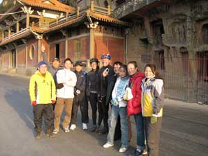 27th November 2005 - Xi'an to Zhouzhi - 74 km We crossed the flat plain leading from Xi'an to the Qinling mountains to the South, once again following again the road G108. The road was busy and we crossed many small towns - all hives of activity. We finally reached the edge of the mountains and we managed to find a camping spot on a small road leading up to a monastery. The road looked quiet, but as Terry checked out the spot, 6 people passed by on bike or by foot. It is difficult to be discreet in China! The only noticeable event of the day was Terry being smacked on the head by a wooden post from a banner above the road. The 2 metre wooden post hit Terry on the head whilst he was checking the map. Luckily Terry's sizeable head resisted the crash thanks to his ever reliable cycling helmet (you never know when it will come in useful).