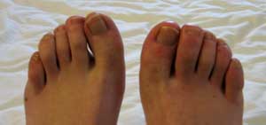 The offending feet, really quite unpleasant. Swollen by the cold to such an extent that Isa's cycling shoes wouldn't fit - still, a spot of nail varnish should do the job |