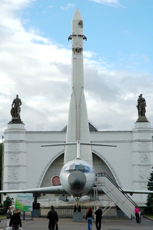 The cosmonaut monument and the "real thing" in the USSR hall of exhibitions (VDNKh).