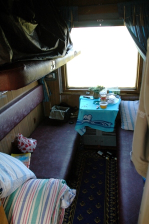 A 4 bed Kupe, booked out for 2 persons and two bikes - not without some initial altercations with the train staff. Both bikes are on the upper bunk bed, with the wheels in overhead storage.