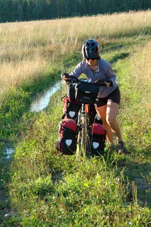 We managed to find another track heading in the right direction. Unfortunately, the track crossed the forest and was extremely muddy. Additionally, with forest always come mosquitoes. And these were fierce and bit through our cycling trousers and shirts. We became totally bogged down in the mud and as a few drops of stormy rain started to fall on us, Terry heard some wailing noises coming from Isa's direction - she was starting to lose her normal calm collected self! It was time for Terry to unveil the whole truth: on top of the mud, cold and pain, we were also lost! The compass has been indicated that the track kept on turning back towards were we had come from. Despair was setting in, but the mosquitoes forced us to keep on moving.