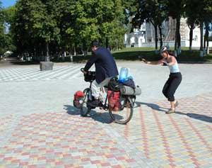 We cycled away to the West of Rostov, there are many beautiful villages with Babushkas selling all sort of garden vegetables in front of their home. Passed the town of Ilinskoye-Khovanskoye, we noticed that two kids were following us on their bikes at a distance. Normally it is not a nuisance, but we just wanted to set up camp unnoticed by the river, so we seriously pushed on until they were not to be seen anymore. As we reached the river and started looking for a spot, the two kids turned up! Damnit! But it was in fact Natalya and her son Roman who spotted us in town and chased up to take a picture of us and our bikes. We were really surprised and were quite happy to pose like sporting stars, hey, hey Unfortunately the night and cold were then setting in and our very quick wash in the river was spoilt by mosquitoes. Cyclotourer life is tough!.