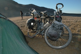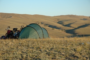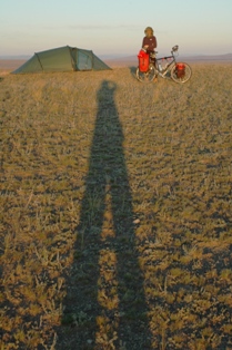 Ce jour requière une mention spéciale. Nous campons sur une colline et la température est devenue durant la nuit extrêmement froide. Avec l'humidité du fleuve en dessous, nous nous sommes réveillés avec une tente totalement givrée ainsi que nos vélos, mais ce qu'Isa a vraiment détesté c'était que le chapeau qu'elle a porté pendant la nuit était totalement gelé. Toute la glace est tombée dans son cou, pas une manière plaisante de se réveiller ! À 8 heures, il y avait - 4°C . Il a fallut beaucoup de tasses de thé pour se réchauffer les doigts.