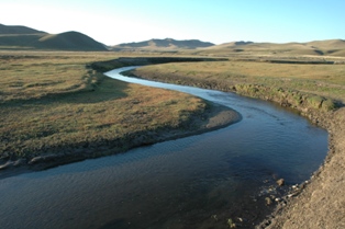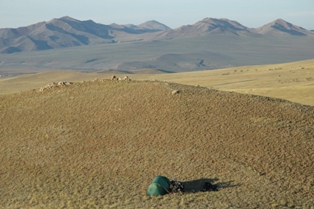 Bien, cela ressemblait a à un emplacement tranquille et agréable avec un cours d'eau tranquille et beau. Pendant que nous étions prêts pour un peu de lavage dans le fleuve «au naturel », un cavalier et ses deux chiens sont apparus par derrière les collines et ont traversé la vallée pour revenir plus tard avec un troupeau de chevaux. Ensuite c'était deux jeunes sur une motocyclette et une fille lavant aussi quelque chose dans la rivière. Nous avons vu cela du haut de notre petite vallée tranquille , Il devait y avoir là quelques familles vivant dans des yourtes que nous n'avions pas repérés !