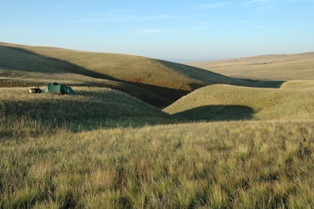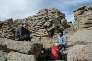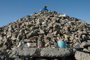 Nous avons vu notre premier « ovoo » aujourd'hui. Il est difficile de comprendre ce que c'est , mais facile à décrire. C'est une pile d'offrandes aux dieux (les Mongols sont encore influencés par le chamanisme), ils se trouvent habituellement sur des passages, de montagnes ou de collines. Quand vous en trouvez un par hasard, vous êtes censé faire une offrande et marcher autour de l'ovoo trois fois dans le sens des aiguilles d'une montre tout en faisant trois souhaits. Pour nous, il satisfait a deux autres fonctions : c'est une bonne détente pour les conducteurs de voiture et une manière commode se débarrasser des déchets. Certains ont mis des bouteilles de vodka ou fanta (vides), des pièces de monnaie, des sachets en plastique, des housses de volant de direction et même des béquilles !