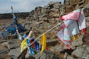 Un Ovoo impressionnant près d'Oulan Bator, celui-ci inclus un petit autel avec des offrandes d'argent
