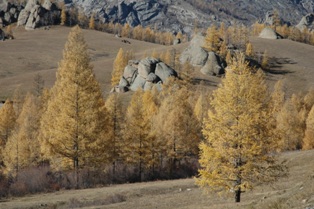 Les seuls secteurs boisés sont les nombreux parcs naturels et les secteurs protégés, où le pâturage est contrôlé et la coupe et le ramassage du bois est interdit. Mais même les forêts protégées près d'Oulan-Bator diminuent parce que des personnes sont trop pauvres pour acheter du charbon pour l'hiver. Il y a beaucoup d'arbres, de bouleaux et de mélèzes dans les forêts, qui prennent des couleurs automnales magnifiques. C'était un vrai festin à voir.