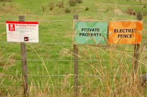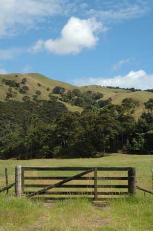 Collines vallonnées, ciel bleu et portes verrouillées. Sur l'itinéraire d'Auckland à Rotarua. il était très difficile de trouver des endroits pour un camping sauvage, il n'y a aucun sentier piétonnier, tous les champs sont complètement clôturés et les portes sont verrouillées