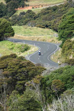 Une descente rapide sur la péninsule de Coromandel, la route monte ou descend - il n'y a aucune alternative.