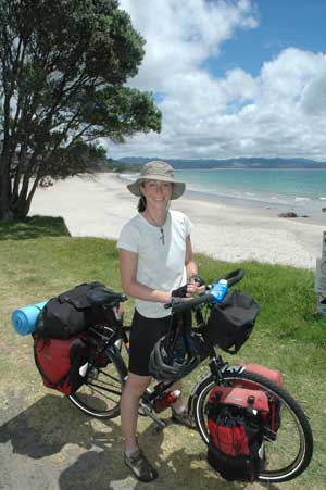 La Nouvelle Zélande est vraiment tranquille et facile comparée à la Chine. Voici un exemple du type de choses qui nous arrive maintenant. Le matin, Isa attendait Terry sur un emplacement de parking. Elle était trop décontractée pour le faire sur le trottoir et elle nettoyait ses lunettes de soleil. Elle a entendu un coup de klaxon léger, a tourné la tête et a vu une femme attendant pour garer sa voiture. Isa s'est déplacée sur le trottoir et a continué à nettoyer ses lunettes de soleil, n'y pensant plus. La femme est venue jusqu'à elle et… s'est excusée… pour avoir klaxonné. « C'était à cause de la voiture derrière moi, je suis désolée, vraiment sans cela, je n'aurait pas klaxonné ». Hé ? ? ? C'est un peu trop civilisé pour nous après plus de deux mois de cyclisme au milieu des méchants conducteurs de camions chinois. 18 Janvier 2006 - de Hahei beach à Whangamata - 75 Km. Montée et descente, montée et descente et encore montée et descente résumerait bien le déroulement de la journée . Les vues n'étaient pas aussi exceptionnelles parce que nous avons principalement traversé un secteur d'habitation. Nous avons seulement revu le Pacifique quand nous sommes arrivés à Whangamata, célèbre pour sa plage de surf, mais nous n'avons pas essayé. Nous avons laissé en arrière les campings surpeuplés (c'est la saison de vacances ici) et nous sommes installés sur un emplacement tranquille dans le bush. |