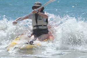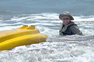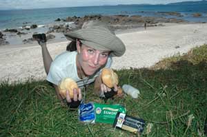 16 Janvier 2006 - Nous essayons de nous reposer à Whitianga. Puisqu'il n'y avait aucune structure élevée (cathédrale, tour ou autre) à gravir, Terry a décidé de passer notre jour de repos en faisant un peu de kayak de mer. C'était sans compter avec le vent violent qui a commencé à souffler à partir de la côte dans notre dos. Nous sommes revenus sur la plage de Whitianga après avoir beaucoup lutté. Pour une fois que ce n'était pas nos jambes qui soufraient !