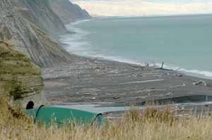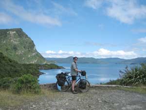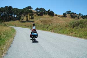 14 Janvier 2006 - de Thames à Coromandel - 62 Km. Nous avons fait une visite rapide du marché de Thames samedi et sommes parvenus à ne pas trop nous charger. Isa a investi dans un sarong pour couvrir son collant de vélo et un choix d'épices ce qui signifie que notre cuisine de camping devrait être un peu plus variée. La route de Thames à la ville de Coromandel a suivi la côte pendant 40 Km nous fournissant des vues merveilleuses de Firth of Thames et des montagnes découpées de la péninsule de Coromandel. La route a alors plongé à l'intérieur des terres et nous avons commencé à affronter les premières côtes. À la différence de la Chine ou les pentes des routes sont tracées pour s'adapter aux camions surchargés et s'élèvent graduellement - ici les routes vont directement vers le haut - avec des pentes de 8% à 16%. Ce qui nous promet des ascensions difficiles et douloureuses. Nous avons été récompensés par de grandes vues sur les îles, les montagnes et les plages éloignées, avant d'entreprendre une descente existante vers le bas de la colline. Nous avons campé ce soir là juste au nord de de ville de Coromandel - avec 4 autres cyclotouristes - HansPeter et Ursula de Suisse (nous nous étions précédemment vus à Auckland) et Axel et Brigit en voyage de noce depuis l'Allemagne.