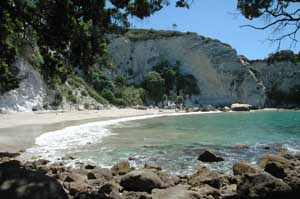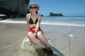 17 Janvier 2006 - de Whitianga à Hahei beach - 20 Km. La péninsule de Coromandel est trop belle et les kiwis trop amicaux. Après quelques causeries avec les gens du pays à Whitianga et en ayant recueilli une longue liste d'endroits à visiter dans le secteur, nous nous sommes arrêtés peu de temps après à Hahei. Le jour était si beau que nous ayons décidé de flâner dans la crique de la cathédrale (une grande arche découpée dans la falaise) et de faire un peu de plongée dans la réserve naturelle marine. Les choses ne se sont pas passées comme prévues. Isa a perdu sa bague entre les rochers et après une heure pour essayer de la trouver, nous n'ayons pas eu assez de temps pour aller jusqu'à la crique de la cathédrale. Quant à la plongée, l'eau s'est avérée être trop trouble pour voir plus loin qu'un mètre !