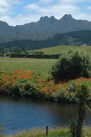 The Firth of Thames avec les « grandes fleurs » populaires qui ont été plantées dans des jardins et semblent coloniser aisément la campagne environnante.