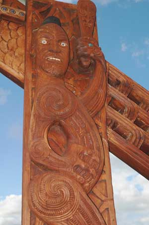 Sculpture maori sur bois à la porte d'entrée d'un cimetière