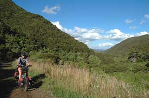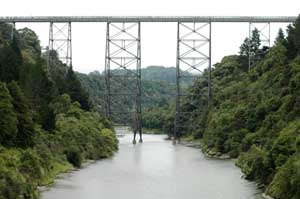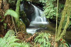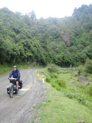 Routes de graviers, des chutes d'eau et de la pluie sur la descente vers le lac Waikaremoana. 25 Janvier 2006 - de Murrapara à Taupeupe Saddle - 66 Km. La plupart du temps la route ressemble à des montagnes russes sur un revêtement de graviers. Mais l'absence de voitures et la forêt tropicale indigène fantastique (le bush) a compensé l'effort. On a battu un autre record ce jour : 1469 mètres ont été montés pour la plus grande joie de Terry ! Le bush était fantastique. Dès que nous sommes entrés dans le parc national de Te Urewera, la forêt était de partout, sur chaque pente. Pas de place pour l'herbe ici. Les fougères géantes, tous les types de podocarps (arbres qui se développent dans seulement quelques parties de l'hémisphère sud) et les hêtres prospèrent. La plupart des arbres sont nouveaux pour nous et sont nommés en maori, ainsi nous faisons vraiment des efforts pour nous rappeler leur nom. Une forte pluie a commencé à tomber à partir de la fin de l'après-midi, nous nous sommes arrêtés sous un abri en béton au sommet du dernier col pour une nuit humide parmi les graffitis et les araignées.