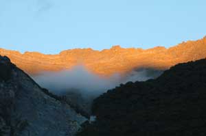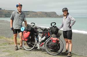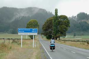 Nous sommes arrivés à Auckland au début du mois de janvier et avons rencontrés de grands ciels bleus et des nuages pelucheux blancs. Parfois les nuages se sont épaissis jusqu'à donner une peu de pluie. La température pour les deux premières semaines était en moyenne de 20° C, avec un peu d'humidité (comparé à la Chine centrale). Pendant la plupart des jours un vent vif soufflait raisonnablement mais avec nos tours et détours, sur l'itinéraire autour de la péninsule de Coromandel et vers Rotarua ceci n'a pas présenté un grand problème. Quand nous avons traversé le secteur de forêt vers le lac Waikaremoana nous avons eu trois journées de pluie constante . Un jour était humide et à 23 degrés, le jour suivant étaient également humides et à 11 degrés C - il est difficile de prévoir quel temps il fera quand on se réveillera. Rappelez-vous juste que le climat est classé maritime - ce qui veut dire que l'on peut voir les quatre saisons en une journée. Le vent peut être un réel problème ici. Pendant notre premier mois, un vent vif raisonnable soufflait mais avec nos tours et détours sur l'itinéraire autour de la péninsule de Coromandel et vers Rotarua ceci n'a pas présenté un grand problème. Dans l'île du sud cependant, le vent a rendu certaines journées de vélo, faciles, très très difficiles, ou extrêmement faciles (nous avons atteint 35 Km/h dans une montée !), mais c'est évidemment rare. Le vent peut également être dangereux et nous faire faire un écart sur le milieu de la route ou nous envoyer dans le fossé. Nous avons dû abandonner d'atteindre le Mont Cook en vélo un tel jour.