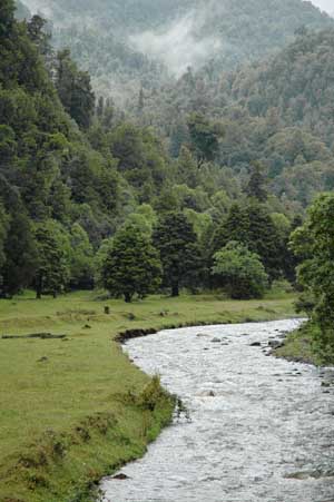 Rivières et forêt avec un peu d'herbe rare, dans le parc national sauvage de Te Urewera.