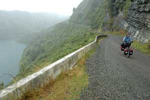 26 Janvier 2006 - de Taupeupe Saddle au Lac Waikaremoana- 101 Km. C'était ensuite tout en descente jusqu'au bijou du parc, le lac Waikaremoana. Malheureusement, la pluie n'avait pas arrêté de toute la nuit et semblait installée pour toute la journée. Nous avons atteint le lac absolument trempés et avons cherché refuge dans une petite cabane près du lac. Toutes nos affaires nécessitaient un séchage . La pluie et le vent combinés étaient si mauvais que certains de nos sacs Ortlieb commençaient à prendre l'eau ! 27 Janvier 2006 - Le lac Waikaremoana. Nous avons décidé qu'un jour au sec ne serait pas un luxe avant de partir au loin sur d'autres routes de gravier. Nous avons utilisé ce jour là pour visiter un autre lac proche, le lac Waikareiti. La promenade dans le bush était impressionnante et l'eau du lac absolument pure. Il y a quelques îles ou sont totalement libres et sauvages des rats des "soats" et des opossums au milieu du lac, c'est aussi un asile pour plusieurs espèces menacées d'oiseaux néo-zélandais. Les opossums ont été introduits d'Australie vers la Nouvelle Zélande pour le commerce de la fourrure. Depuis ils se sont échappés et on estime qu'il y en a maintenant 70 millions errant en Nouvelle Zélande. Ils mangent le bush indigène et gagnent la compétition pour la nourriture avec l'avifaune endémique telle que le kiwi. Le DOC. encourage leur destruction avec des pièges à opossum ; et la vente de fourrure d'opossum pour $75 par kilo. Étonnamment en Australie l'opossum est menacé et est une espèces protégée.