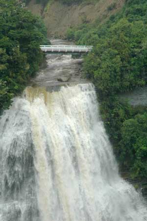L'impressionnante pluie alimente les chutes de Mokau sur le rivage du lac Waikaremoana, Isa est juste visible sur le pont.