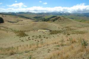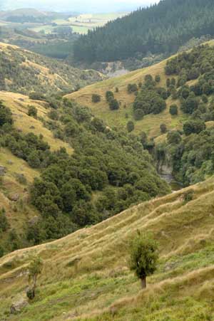Plus de moutons, plus de collines, plus de barrières. Nous notons maintenant les signes sérieux de l'érosion et de l'eutrophisation dans les fleuves et les étangs. C'est un grand changement de l'eau primitive des fleuves autour du lac Waikaremoana. Mais nous avons vu deux choses dans le pays des moutons. La belle plage de Porangahau et la colline qui a le nom de lieu plus long dans le monde. Nous avons compté 85 lettres mais avons pu en avoir manqué une ou deux !