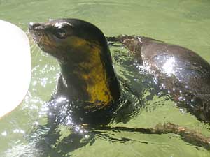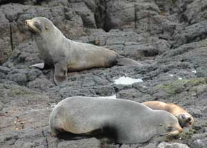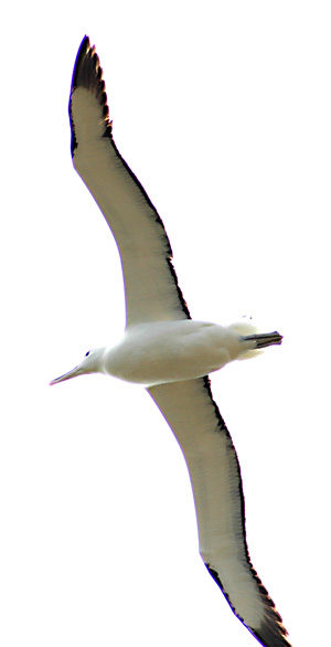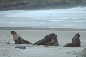 Pendant que nous étions à Dunedin nous avons visité la péninsule d'Otago. Cela faisait partie d'une excursion organisée parce que l'accès aux meilleures plages par voie de terre est limité par le passage sur des propriétés privées. Les différentes compagnies d'excursion ont des accords monétaires avec les fermiers pour permettre l'accès sur leur terre. L'accès par la mer est également possible car les bords de mer sont accessibles au public. (à droite) L'albatros royal - De la partie élevée de la pointe de la péninsule on peut observer ces oiseaux gigantesques - C'est le plus grand oiseau volant au monde, pesant jusqu'à 9 kilogrammes avec une envergure de 3.3 mètres. Par une bonne journée venteuse les adultes peuvent être vu planant autour du promontoire et sur la houle de l'océan pacifique (en comparaison la plus grande mouette a une envergure de seulement 1.2 mètre).