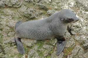 (ci-dessus) un phoque à fourrure juvénile sur la péninsule d'Otago. Ils sont différents des phoques communs parce qu'ils marchent correctement sur leurs nageoires