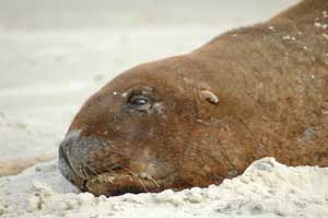 Un male lion de mer de 4 ans se détendant sur la plage. Étant au sommet de la chaîne alimentaire ils n'ont pas peur des humains. On peut marcher à quelques mètres d'eux - la seule réponse normale étant un bref clignement des paupières et puis - de nouveau ils prennent un bain de soleil.