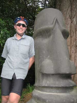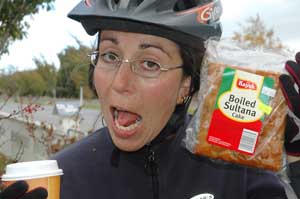 19 Janvier 2006 - de Whangamata à Katikati - 73 Km. Une autre grande montée dès le départ pour réchauffer nos jambes. Mais la pluie nous a rattrapé à Waihi. Nous avons juste eu le temps d'atteindre un café et échapper à la douche. Nous sommes parvenus à passer 2 heures et demi en mangeant des sandwichs et en buvant des bols énormes de café, avant de manquer de choses à faire, manger et parler. Heureusement la pluie s'est arrêtée peu de temps après et nous sommes retournés sur les vélos.