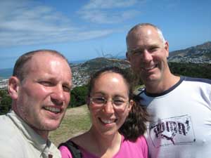 Simon, Terry et Isa sur le mont Victoria au dessus du port de Wellington.