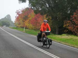 On leaving Dorrigo, we found out that the hills were not gentle at all. This was one of our hardest day cycling in Oz. To complement the English looking landscape, a persistent and annoying drizzle settled on us, followed very closely by thick banks of fog. We were suddenly cycling in the heart of winter. The temperature dropped to 9dC and with the low visibility it really did feel like we were back to England if it was not for the parakeets flying through the fog from time to time. This was the "Waterfall way" section of our ride. The fog threatened to spoil the whole experience, but it did lift out a little to make us have a look on the magnificent Ebor falls. Then we were back cycling in the drizzle up to Cathedral rocks national park. The moral was pretty low, as it infallibly happens after a wet day cycling. But on approaching our campsite, we spotted our first kangaroos (not run over by the side of the road). What a sight to be seen. They are tall (1.60 m) and we were relieved that they chose to bounce away in huge leaps as we approached. If they were to turn around and box us around the ears, we would surely struggle to defend ourselves. |