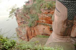15th December 2005 - Leshan and its Big Buddha This day of rest involved a lot of walking up and down, trying to see the giant buddha (71 m high, the highest in the world - fact of the day!) from all angles. It was well worth the effort to see this 1400 years old giant carved off the sandstone cliffs. We also saw a collection of other buddhas, more recent, one of them is a 170m long sleeping buddha - cheekily carved out a whole mountain side. The downside to the pleasure of visiting empty sites during the off-season is fighting off the desperate people who pray on tourists. We got conned twice that day: once by a rickshaw driver who literally took us round the corner to a bus stop and later at night in a hot-pot restaurant. Hot-pot is a popular street food in Sichuan: there is a big pot of boiling water with chilli oil in the middle of the table and you cook in it whatever you fancy. We like it because we can see what we eat. Having said that, we were sold various kinds of intestine and other unidentified bits of meat, thinking they were big flat pastas. As we were far down the line of "we dare you" type of food, we even got (knowingly) some chicken feet. The flaps between the toes are vaguely tasty (of chicken) but god aren't they chewy! Frankly life is too short and if anybody offer you some in an aperitif/Christmas nibbles, don't bother. Oops, I have gone off the point. The bill came out at 133 yuan, which is way over the top. We simply refused to pay and waited until the bill came down to 80 yuan (still a rip off). China is sometimes tiring... |